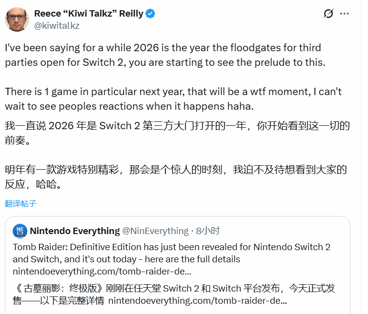 KiwiTalkz表示,目前玩家已能观察到3A游戏向Switch 2移植的初步迹象,而2026年将是这一趋势的集中爆发期:“我此前就多次提到,2026年第三方游戏会为Switch 2打开‘水闸’,现在大家看到的种种迹象都在印证这一点。”