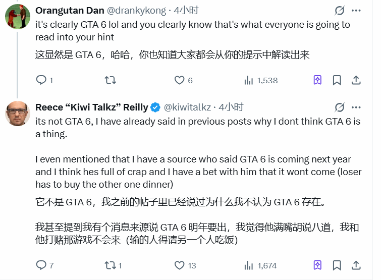 不过KiwiTalkz也明确澄清,这款神秘大作并非玩家热议的《侠盗猎车手6》(GTA 6)。他还分享了对《GTA 6》的看法,称虽有消息称该作将于明年发售,但自己对此持怀疑态度,甚至已与消息人士打赌(输家请客吃饭),认为《GTA 6》不会在明年推出。