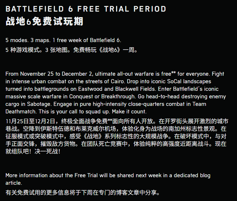 刚迎来赛季中期大更的《战地6》,紧接着就为玩家送上重磅福利——11月25日至12月2日期间,游戏将开启为期一周的全平台免费试玩活动,玩家无需购买即可体验3张经典地图与5种核心对战模式,新老玩家都能畅享战地战场的热血对决。