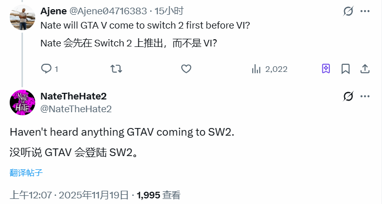 在此之前,不少玩家推测R星可能会优先选择移植难度更低的《三男一狗》到Switch 2平台。不过这一猜测在今日被NateTheHate2直接否定,他在回复网友提问时明确表示:“没有听说任何关于三男一狗登陆SW2的消息。”