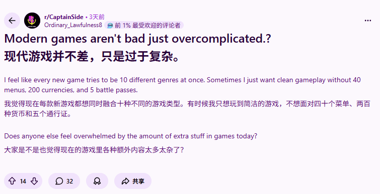 发起讨论的玩家直言:“我觉得现在每款新游戏都想同时融合十种不同的游戏类型。有时候我只想玩到简洁的游戏,不想面对四十个菜单、两百种货币和五个通行证。大家是不是也觉得现在的游戏里各种额外内容太多太杂了?”这番话道出了不少玩家的心声,也引发了对游戏内容设计的集中探讨。