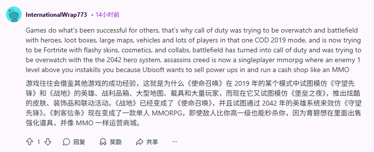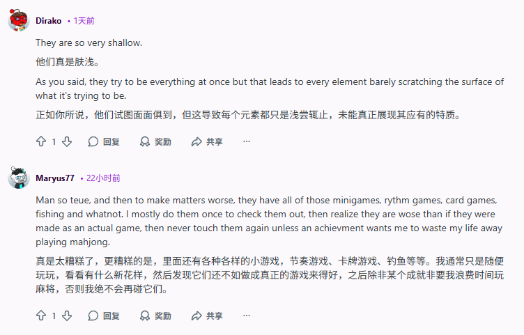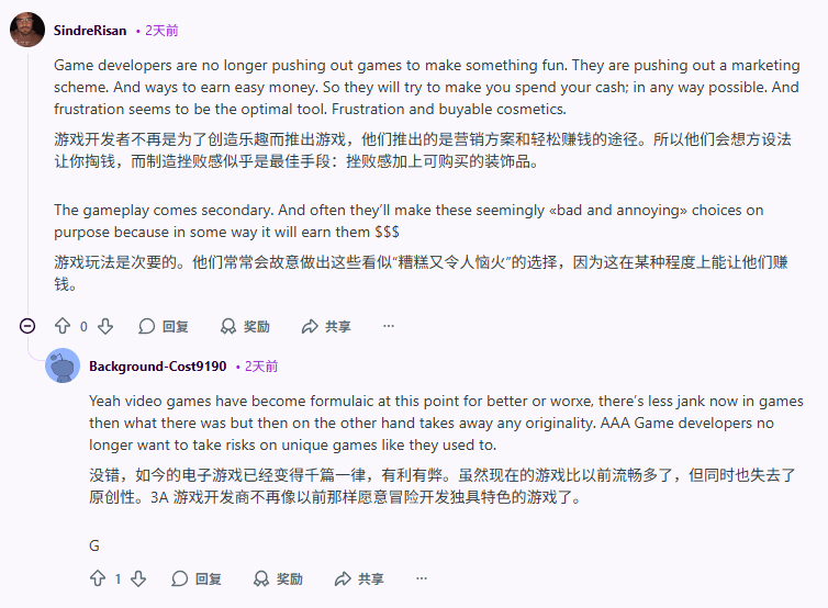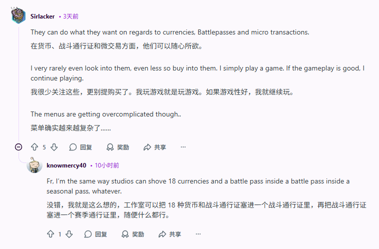 在回复中,有玩家从游戏定位转变的角度分析:现代许多游戏已从单纯的“玩游戏”转向构建社区生态,除了核心玩法,还充斥着通行证、内购项目以及为维持活跃度而设的各类任务,让游戏体验变得不再纯粹。还有玩家聚焦RPG游戏吐槽“重复要素太多”,不过也有不同观点认为“这是经典打怪升级模式,人各有所爱”,展现出玩家对游戏内容的多元看法。