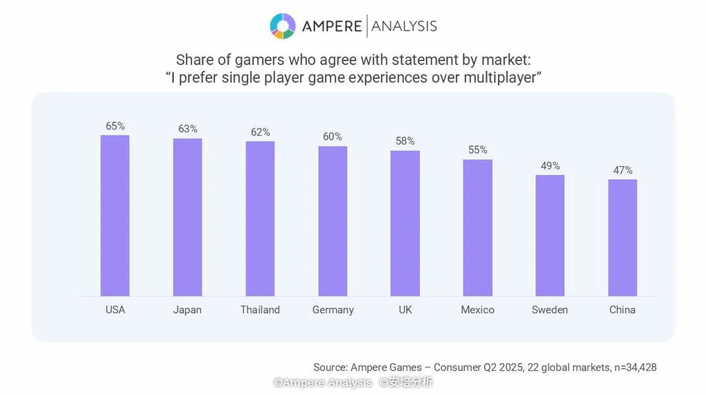 近日,安培分析公司发布了一项覆盖34428名玩家的大型调查,聚焦全球玩家对单人游戏与多人游戏的偏好差异。结果显示,“更喜欢单人游戏”成为多数国家玩家的共识,但年龄因素却催生出截然不同的选择倾向,尤其是年轻群体对多人游戏的偏爱格外突出。
