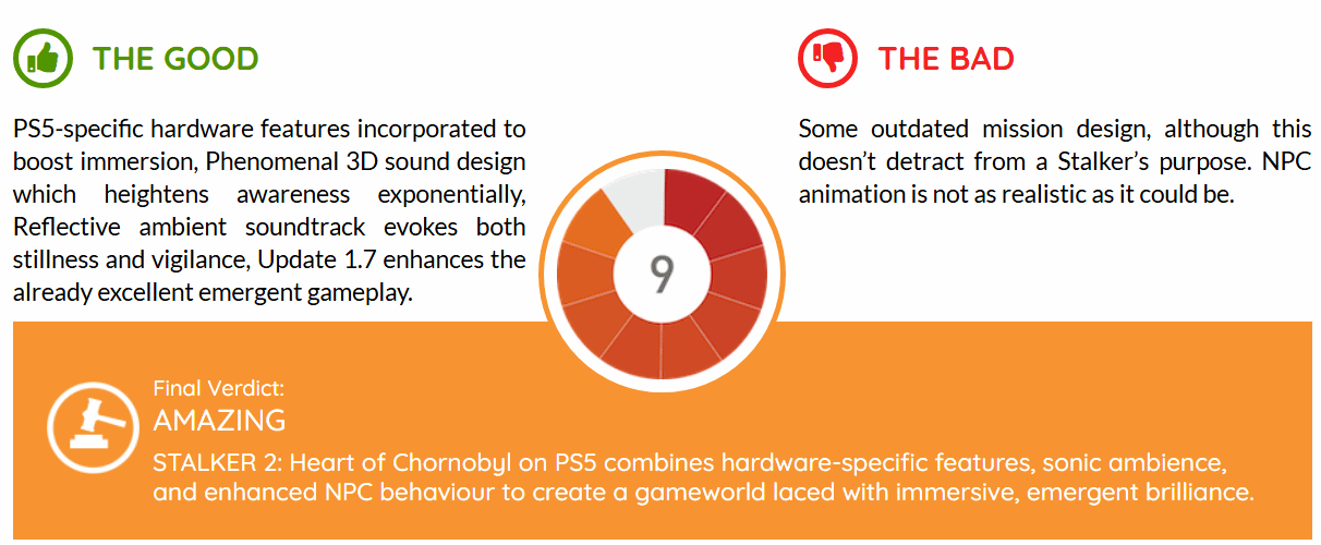 尽管有瑕疵,PS5版《潜行者2》仍以沉浸体验、音效设计及玩法强化获外媒认可,是末日生存题材玩家的期待之作。