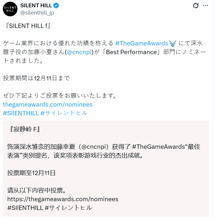 官方在推文中明确表示:“『SILENT HILL f』为表彰游戏业界杰出成就的The Game Awards中,饰演深水雏子一角的加藤小夏(@cncnpi)获得了‘Best Performance’部门的提名。”同时着重提醒,投票期将持续至12月11日,并附上投票链接,希望粉丝能以实际行动支持加藤小夏,让她的精彩演绎获得最终认可。