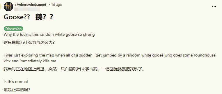 这款上线前便收获超1000万玩家预注册的武侠新作,目前在Steam平台保持着日均16万左右的同时在线人数。然而在游戏的Reddit讨论区与Steam论坛中,最热门的话题并非炫酷武功或宏大世界观,而是大量海外玩家带着困惑与无奈发帖"控诉":自己竟打不过一只鹅。