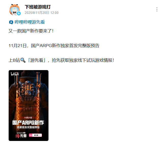 国产游戏圈再添新动态,一款备受期待的ARPG新作即将揭开神秘面纱。据B站游戏区官方账号“下班被游戏打”消息,11月21日,该作将通过B站“游先看”栏目公布独家首发的完整版预告,引发玩家群体的高度关注。