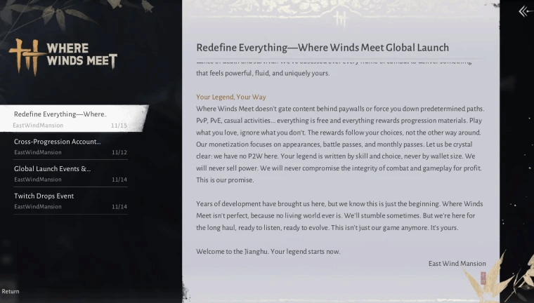 开发商Everstone Studio选择了一个极具诚意的沟通渠道——在游戏启动器中直接发布致社区的公开信。这种跳过第三方平台、直接与玩家对话的方式,本身就传递出对用户疑虑的重视。公告中,团队用清晰直白的表述消除了玩家的核心担忧:“《燕云十六声》不会将内容关闭在付费墙之后,也不会强迫您走预定的道路。PvP、PvE、休闲活动……所有内容都是免费的,所有内容都会奖励您进步所需的材料。”
