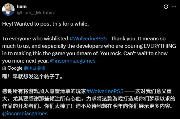 PS5独占游戏《漫威金刚狼》自公布以来便备受玩家期待,近日游戏中金刚狼的饰演者Liam McIntyre通过推特与玩家互动,为这份期待再添一把火。他发文感谢所有将游戏加入愿望单的玩家,并透露“已经迫不及待要在明年展示更多内容”,让粉丝对这款作品的后续动态充满遐想。