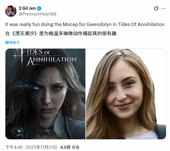 国产新作《湮灭之潮》近期迎来新动向——女主角格雯德琳的动捕演员疑似被曝光,推主2 Gil Jen发文自曝身份,并晒出日常照片,引发玩家对角色形象的好奇与讨论。