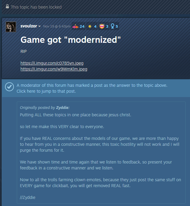 版主锁定批评帖的行为被玩家解读为“压制言论”,Steam社区随即涌现出大量声援帖与质疑帖。“为什么耗费资源重制,新模型反而不如原版?”“如果是为了所谓的‘审查和谐’牺牲角色设计,不如直接移除愿望单”“拒绝跟风生硬的设计潮流”等声音成为主流,部分玩家还发起了集体移除愿望单的行动,以此表达对开发商的不满。