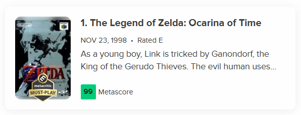 M站99分代表近乎完美的口碑,《时之笛》凭此力压《灵魂能量》《GTA4》(均98分),稳坐游戏史评分第一。2011年推出的重制版《时之笛3D》虽扩大了玩家群,但原版的传奇地位始终未动摇。