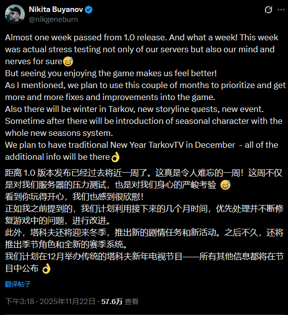 此前,开发多年的《逃离塔科夫》1.0正式版本登陆Steam平台,然而上线初期便遭遇“炸服”问题——大量玩家反馈无法正常登录,或需等待极长时间才能进入游戏,引发广泛关注。近日,开发商Battlestate Games的CEO兼游戏总监尼基塔·布亚诺夫(Nikita Buyanov)在个人社交媒体上回顾了这一特殊时期的感受与游戏后续规划。