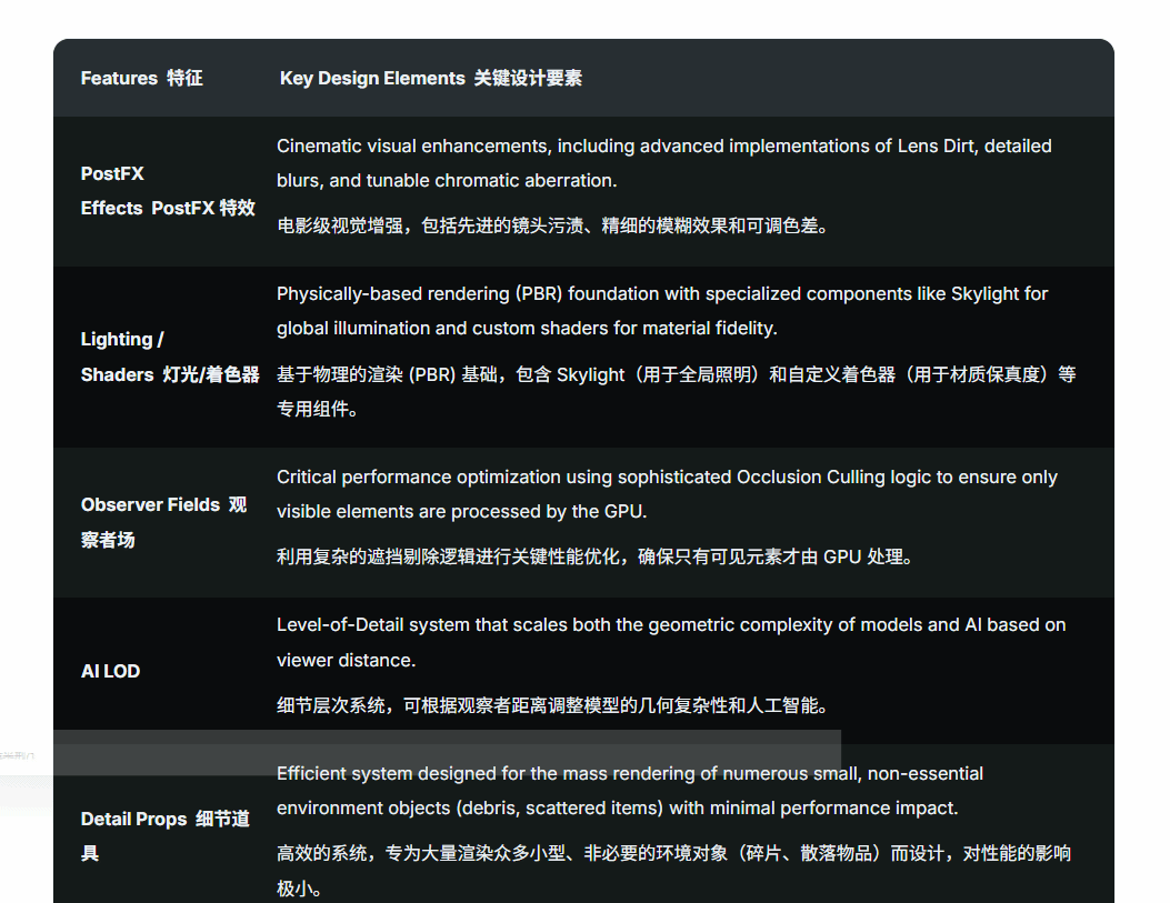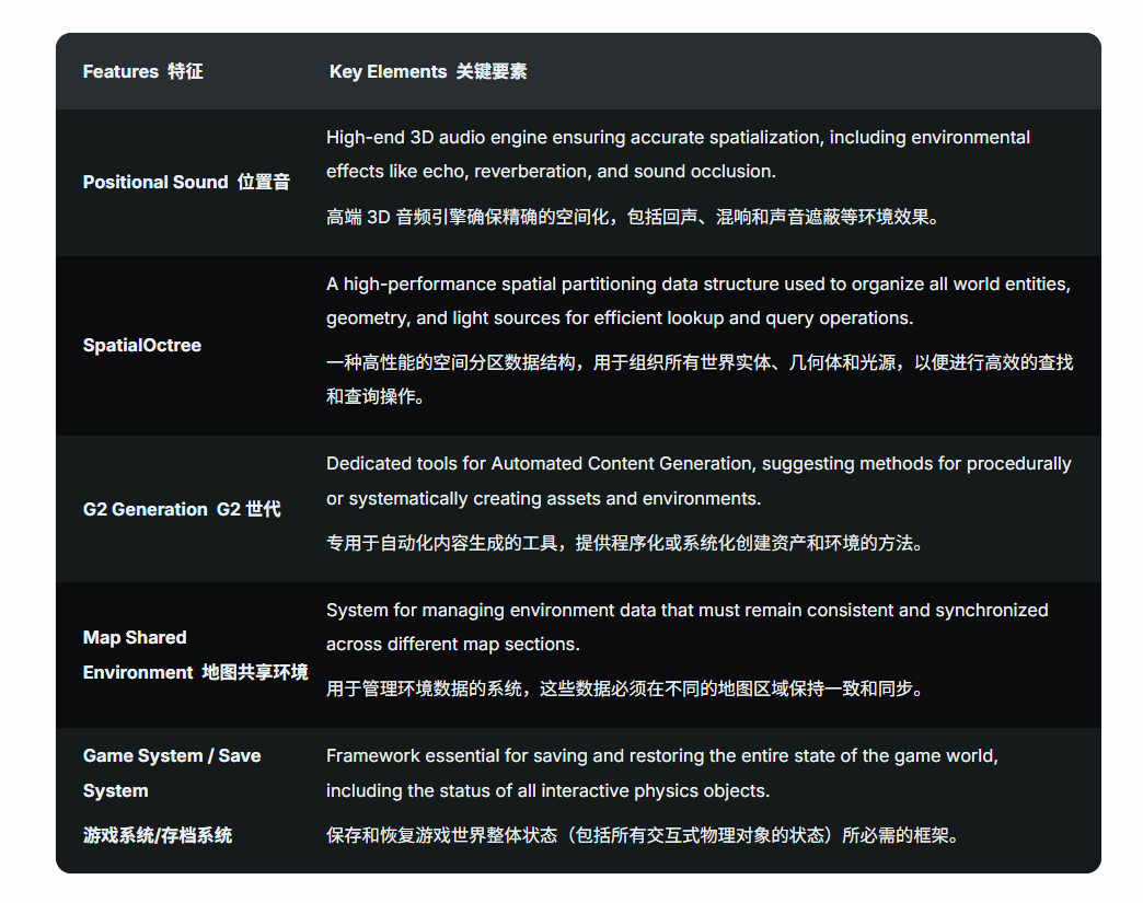游戏机制将与核心引擎特性深度融合。增强的音频体验通过定位音效系统提供精准3D音频效果,强化潜行玩法,使NPC能探测玩家动静并做出反应。空间八叉树数据分区结构将组织所有视觉元素,实现游戏内元素间高度优化的交互;G2生成系统的引入则能快速创建关卡和区域。此外,跨地图管理数据的存档系统,将进一步提升游戏世界的沉浸感。