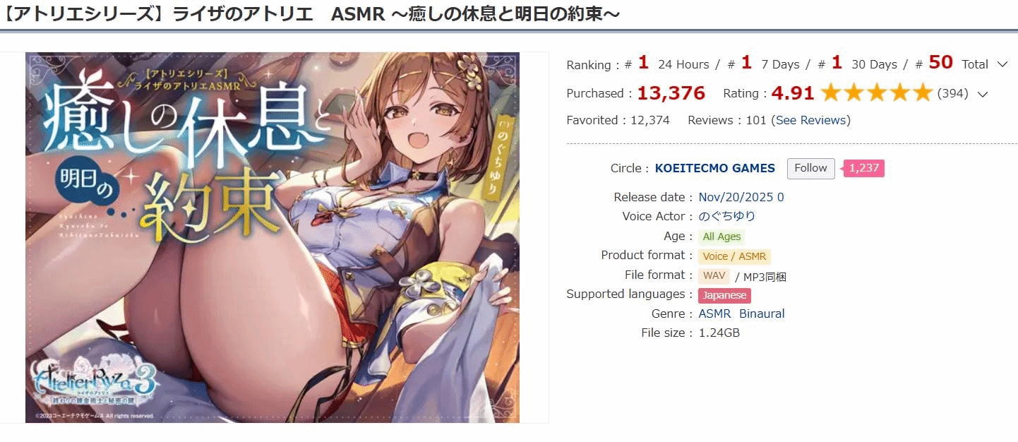这款ASMR自上线以来,在DLsite的销量与人气榜单中表现抢眼,目前累计购买量已达13,376次,据此估算营收约为11万美元。在平台"语音/ASMR/音乐"分类的历史购买量排行榜中,该作品位列第37名,在DLsite全平台历史购买量总榜中则占据第50位。