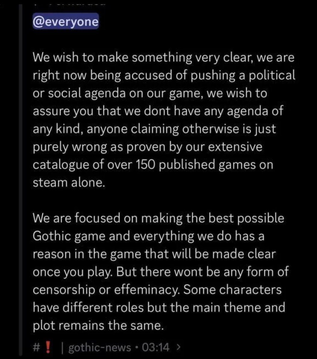 官方同时作出承诺:“不会有任何形式的审查或女性化倾向。”尽管部分角色的定位可能有所调整,但游戏的核心主题、故事脉络与原作精神将保持一致。事实上,在正式声明发布前,已有开发团队成员在Steam论坛回应玩家,表示工作室正在评估所有收到的反馈,并将尽快公布针对争议的具体决定。