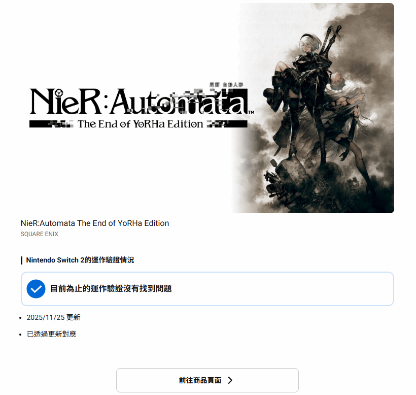 兼容性修复的消息也得到了官方渠道的确认。据任天堂Switch2兼容性查询平台显示,《尼尔:机械纪元》的适配状态已更新为“可正常游玩”,此前标注的“存在闪退风险”提示已被移除。这意味着经过优化后,游戏能充分适配Switch2的硬件环境,无论是战斗场景还是剧情过场,都将告别意外中断的情况。