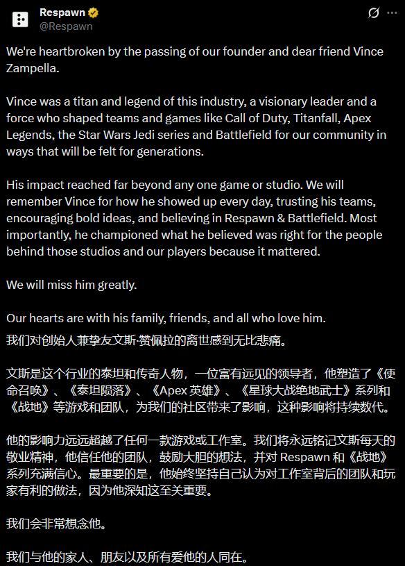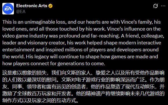 Zampella离世的消息已得到EA官方确认,EA方面发表声明称:“这是一场令人难以承受的损失,我们的心与Zampella的家人、亲友以及所有被他作品打动的人们紧紧相连。Vince对电子游戏行业的影响深远而广泛,作为朋友、同事、领导者与极具远见的创作者,他的作品定义了现代互动娱乐的形态,激励了全球数百万玩家与开发者。他留下的精神遗产,将在未来数代人中持续影响游戏的创作方向,以及玩家之间的联结方式。”
