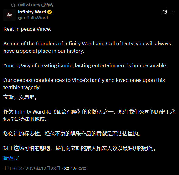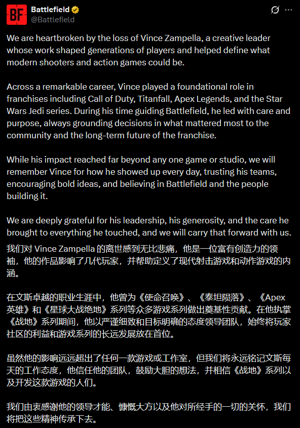 除EA外,Respawn官方、《战地》品牌官方账号、Infinity Ward等相关方也纷纷发文,向这位游戏界的殿堂级人物表达哀悼与敬意。