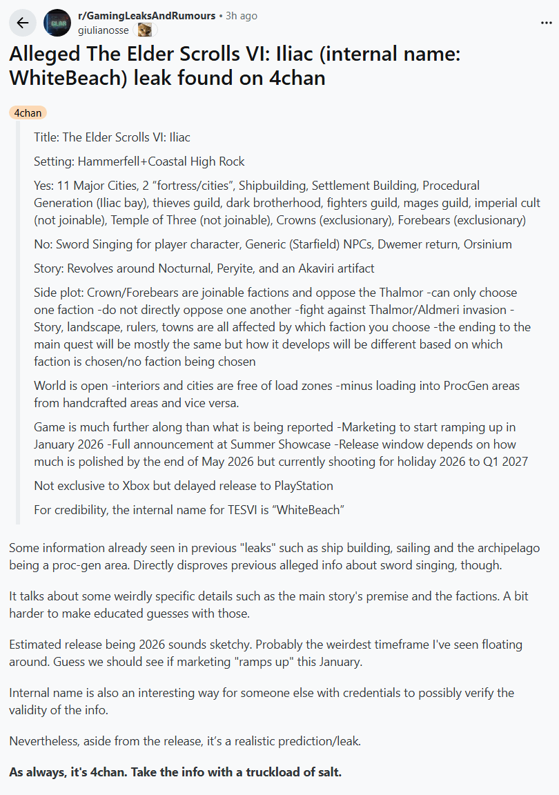 近日,外网流传一篇据称源自《上古卷轴6》内部的英文长文,曝光了海量游戏相关细节,瞬间引发系列粉丝热议。从副标题、世界观设定到开发进度、发行计划,这份爆料覆盖多个核心维度,不过目前所有信息均未得到官方证实,仍需理性看待。