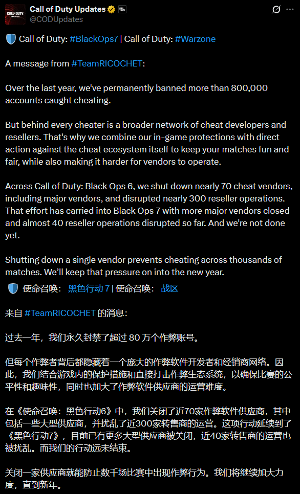 除了技术层面的硬实力,团队还建立了与玩家的高效联动机制。RICOCHET团队持续活跃于社交媒体平台,会直接回应玩家反馈的可疑对局视频,并在违规账号被核实封禁后及时向玩家同步处理结果,形成“玩家举报-官方核查-快速处置”的闭环。这种技术与社群联动的模式,大幅提升了反作弊行动的覆盖面与响应效率。