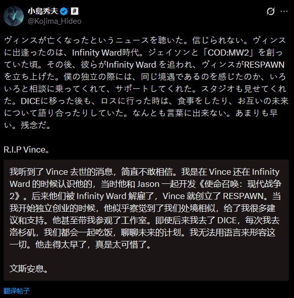 知名游戏制作人小岛秀夫也通过社交平台发布悼文,缅怀这位行业同仁。小岛秀夫在文中写道:“听闻文斯离世的消息,我至今难以相信。我与他的初次相识,是在他任职于无限 Ward(Infinity Ward)期间,当时他正与杰森(编者注:指《使命召唤》系列资深开发者杰森·韦斯特(Jason West))联手打造《使命召唤6:现代战争2》。后来两人离开无限 Ward,文斯创办了重生娱乐。在我开启独立创作之路后,他或许是深知其中艰辛,不仅给了我诸多宝贵建议,还向我伸出援手,甚至带我参观了他们的工作室。”
