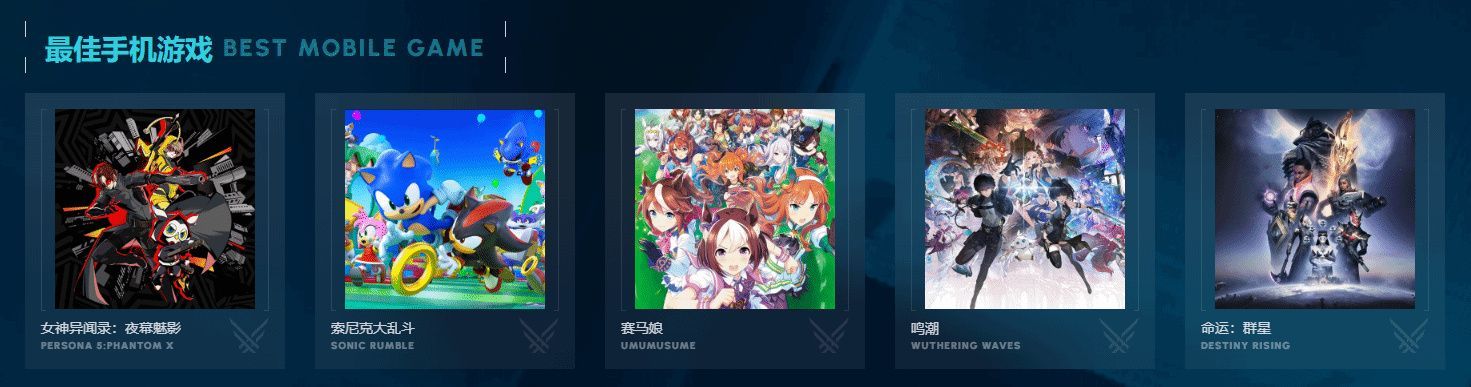 《鸣潮》与《女神异闻录5》IP衍生手游《女神异闻录:夜幕魅影》、《索尼克》IP衍生手游《索尼克大乱斗》,均在本年度TGA颁奖典礼中获得最佳手游提名,最终均不敌《赛马娘》无缘奖项。这三大IP此前曾是奖项竞争中的“对手”,如今早已敲定联动合作,这一安排让不少粉丝直呼双厨狂喜。