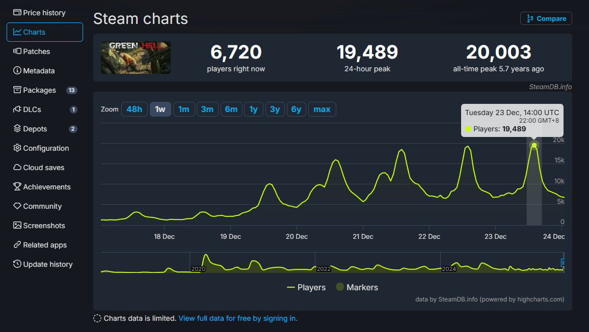 SteamDB的实时数据印证了这波热度爆发:12月23日,《绿色地狱》的同时在线玩家数突破1.9万,距离2020年的历史峰值仅一步之遥。而驱动这场热度飙升的核心原因,正是其堪称“白送”的促销定价——作为Steam冬促活动的一部分,该作当前国区售价仅8元,海外版本也低至2-3美元,这个价格甚至低于一杯普通奶茶,却能解锁市面上最拟真的丛林生存体验。据悉,此次促销活动将持续至1月6日,之后价格将恢复正常。
