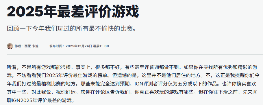 今日, IGN发文梳理了2025年度表现不佳的多款游戏。这份盘点榜单中的作品,在IGN的评测体系里得分均未超过5分,不过较为庆幸的是,本年度并未出现评分低于4分的极端劣质作品。