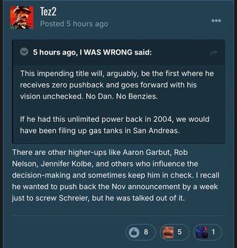 根据Tez2的爆料,Sam Houser在得知Jason Schreier提前泄露官宣计划后,情绪陷入极度愤怒。知情人士进一步透露,他当时甚至认真考量过将原定的官宣日期与预告片发布时间整体延后一周。不同于常规的技术问题或宣发策略调整,这次拟议中的推迟毫无商业层面的考量,纯粹是为了让Schreier的“预言”落空,用实际行动证明“没有任何人能预判R星的节奏”。