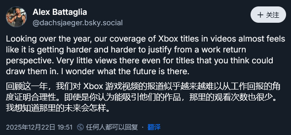 Alex Battaglia提到:“复盘这一整年的内容创作,单从投入与回报的平衡来看,我们团队制作的Xbox游戏相关视频,已经越来越难找到持续推进的合理理由。即便是那些原本预判能吸引核心受众的内容,实际播放数据也不尽如人意,这让我不得不思考这类内容的未来走向。”