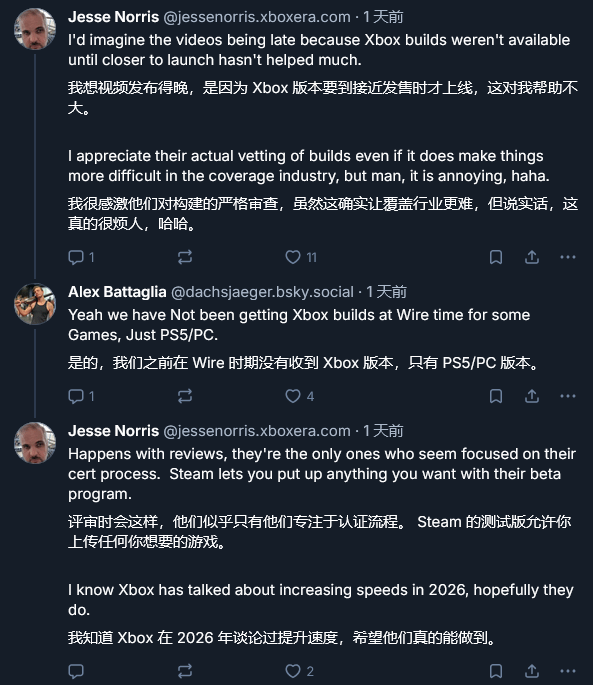 他的这番感慨很快得到同行响应。XboxEra编辑Jesse Norris直言,Xbox的游戏推广策略存在明显短板,其中最突出的就是相关内容发布普遍滞后。“核心问题在于,Xbox通常要等到游戏临近发售时,才会把评测版本寄送给媒体,这对内容传播效果肯定有负面影响。”Jesse Norris补充道,“我理解并认可他们对内容版本进行严格审核的态度,即便这种做法确实增加了我们内容创作和报道的难度,说实在的,有时候真的让人感到困扰,哈哈。”