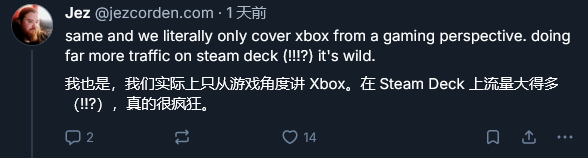 Windows Central执行编辑Jez Corden同样认可Alex Battaglia指出的问题,他透露:“我们团队的报道核心几乎全围绕Xbox游戏内容展开,但实际情况是,Steam Deck相关内容带来的流量反而高出不少,这种反差确实超出预期。更值得关注的是,Xbox相关内容产生的点击量,如今已经无法支撑对应的运营开支了。”