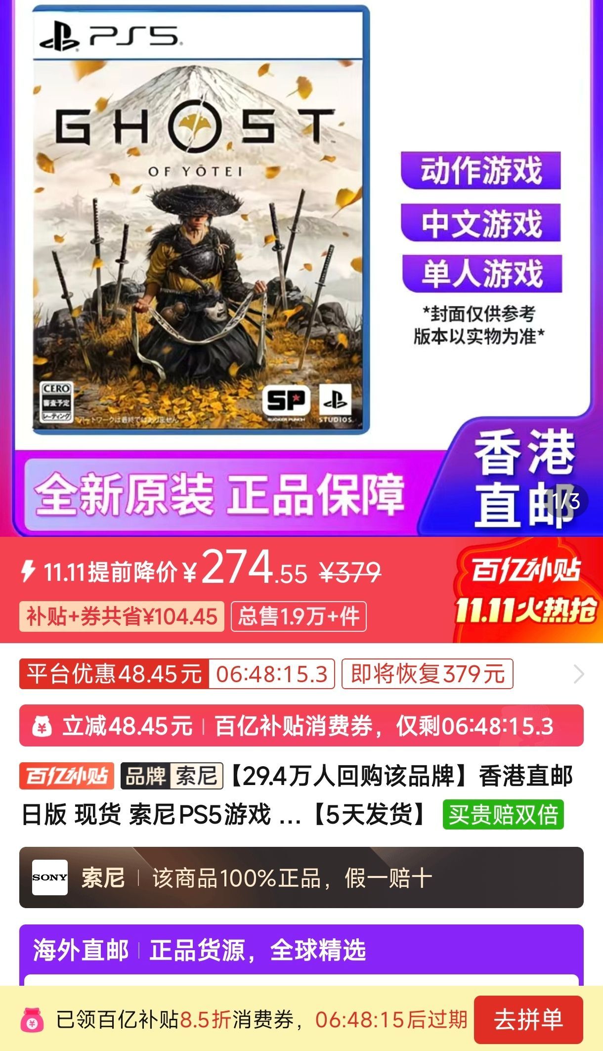 截至目前,该电商平台百亿补贴板块中,《羊蹄山之魂》PS5日版光盘的最低售价已升至341元;而港台版本的价格更高,当前售价达到405元。