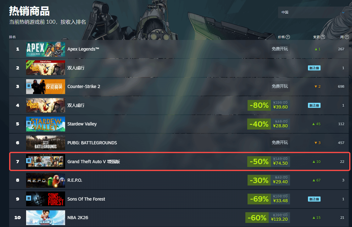 值得关注的是,有着“长线畅销佳作”之称的《GTA 5》热度依旧不减。截至发稿时,该作仍稳定位居Steam国区热销榜前十行列,市场表现力十分强劲。