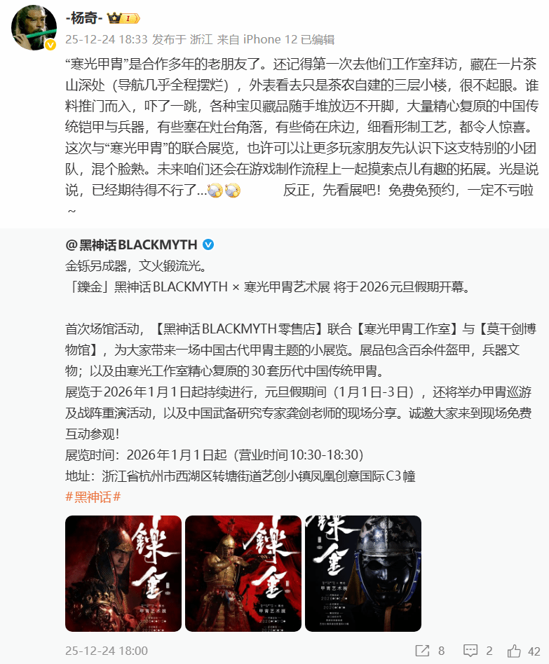 昨日消息,“鑠金”黑神话BLACKMYTH × 寒光甲胄艺术展将于2026年元旦假期正式开幕。