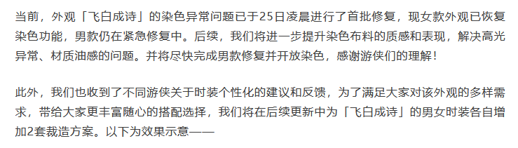 昨日凌晨,游戏官方通过更新公告作出回应,称该争议设计实为染色效果异常所致。官方表示后续将进一步优化染色布料的质感与呈现效果,解决高光过度、材质泛油光等问题;同时,会在后续更新中为该时装的男女款式分别新增两套剪裁方案。