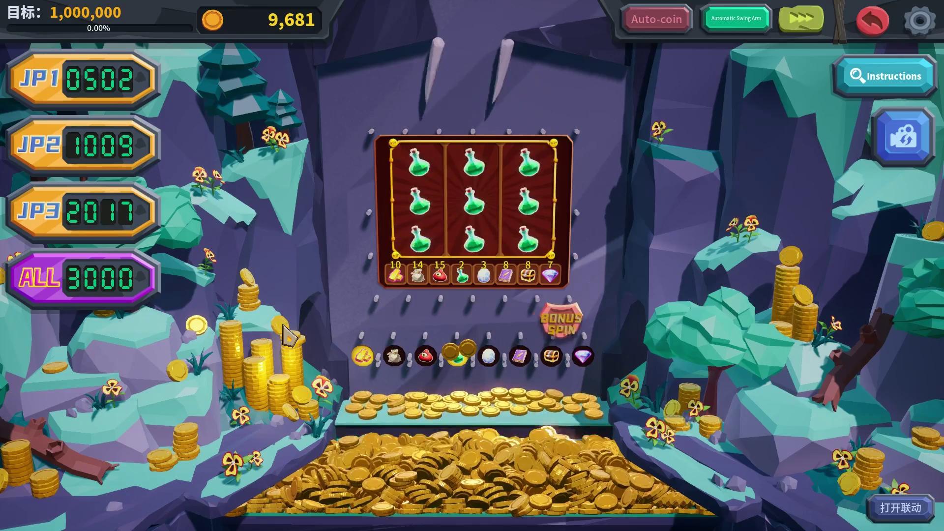 游戏中玩家可以体验到1:1还原的推币机模拟器,其中转转乐、叠叠乐、JP123大奖,全盘大奖都可在游戏中体验!快来赢属于你的全盘大奖吧!