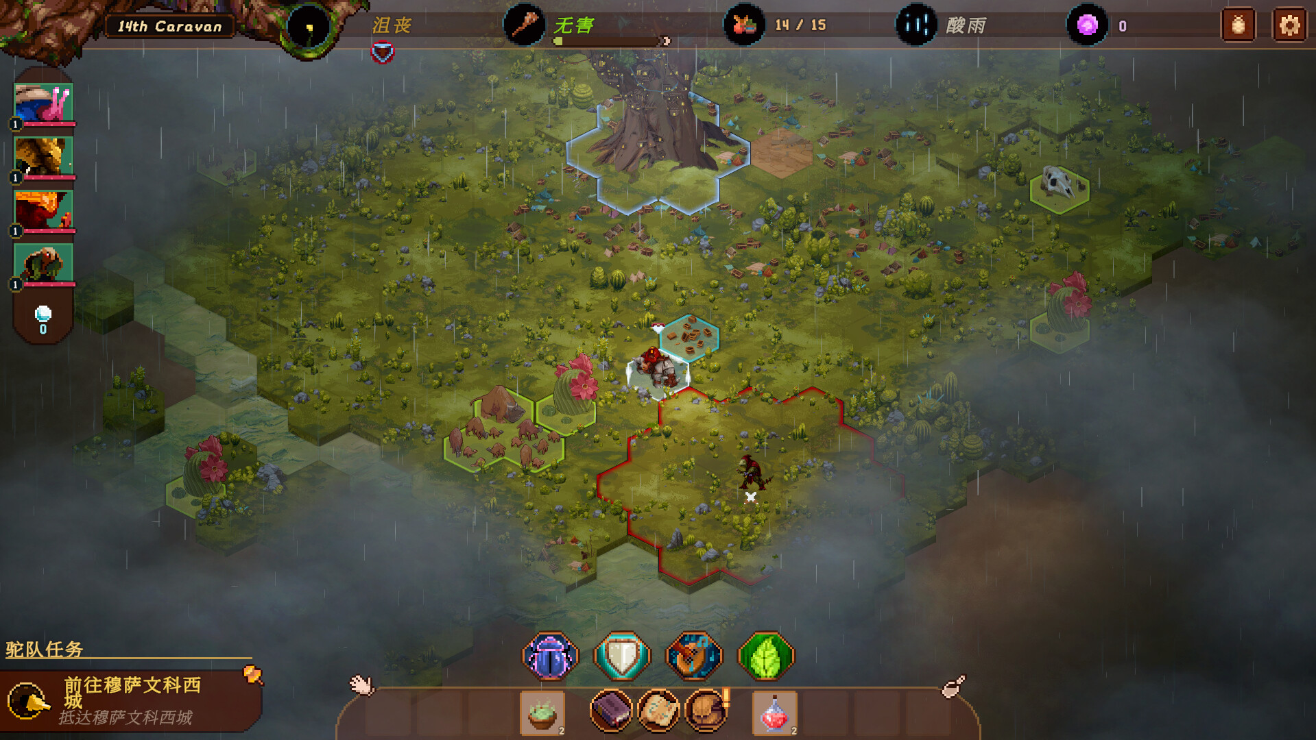 分配好干粮,探索不同的地区,收集各种生物群落的资源,为接下来的冒险做好准备。拜访各个城镇,与其他部族建立外交关系,做出短期与长远的决策。