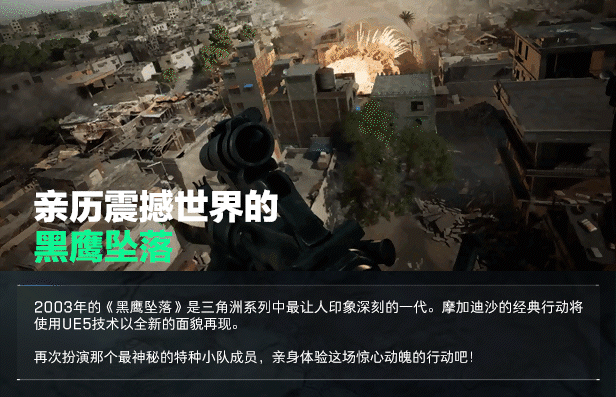 - 黑鹰坠落:以2001年的电影作品为蓝本进行重制的系列,玩家将扮演传奇三角洲行动干员,亲历经典战役。