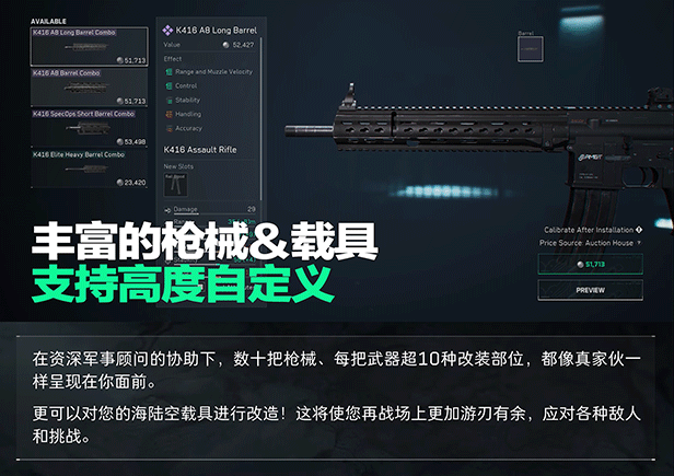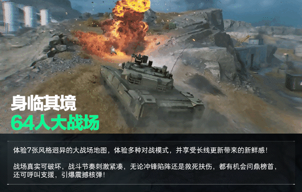 - 全面战场:踏入海陆空战场,在史诗般的32v32大战场与敌人战斗,体验多种不同的载具与独特的战术装备。