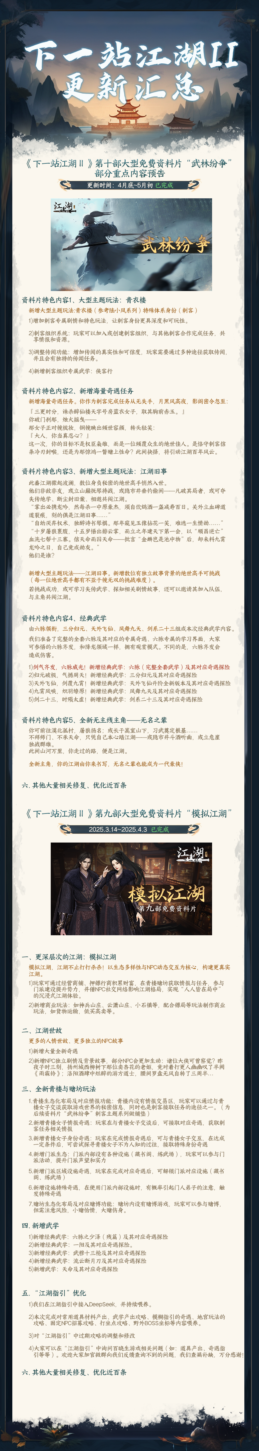 庞大内容、及时更新:上线迄今已超过百更、八部大型玩法资料片!2025年我们将继续砥砺前行,用更多更好玩的内容来填充这个江湖大世界!