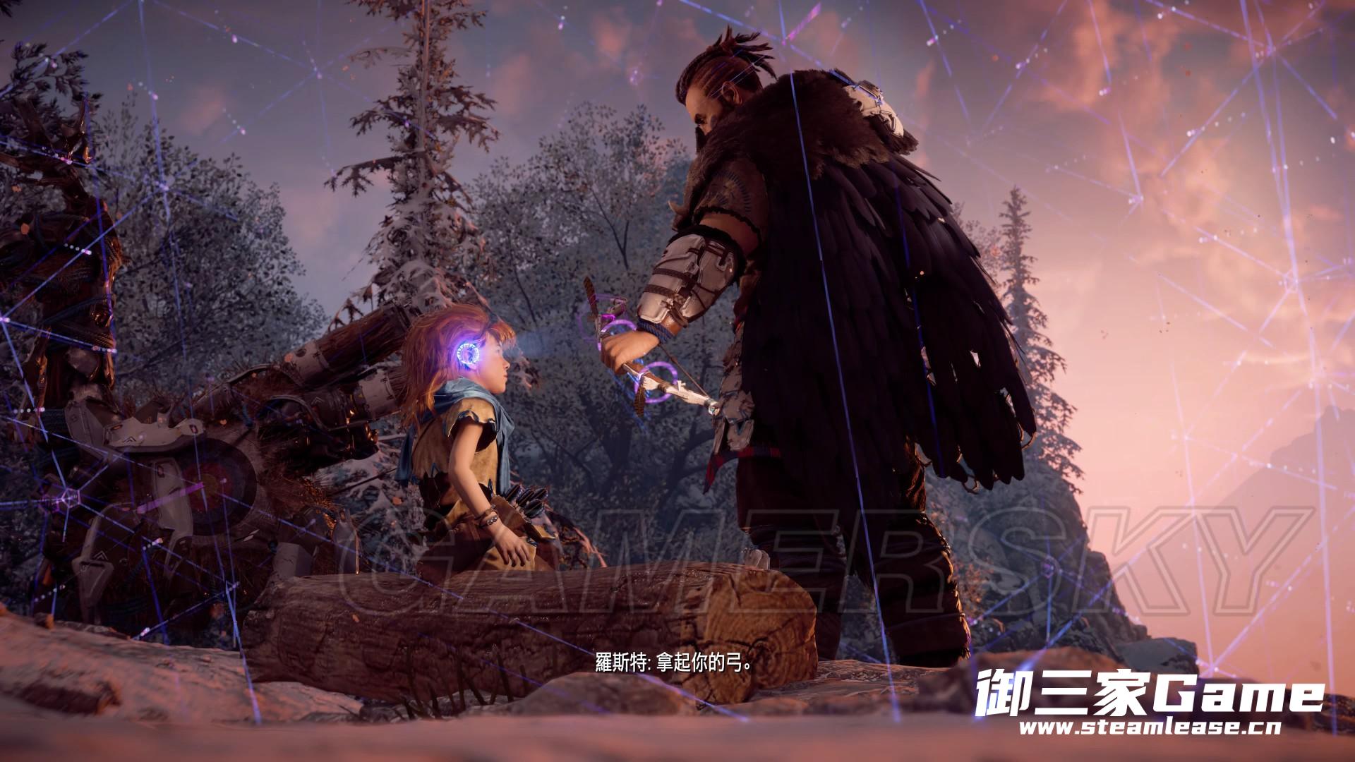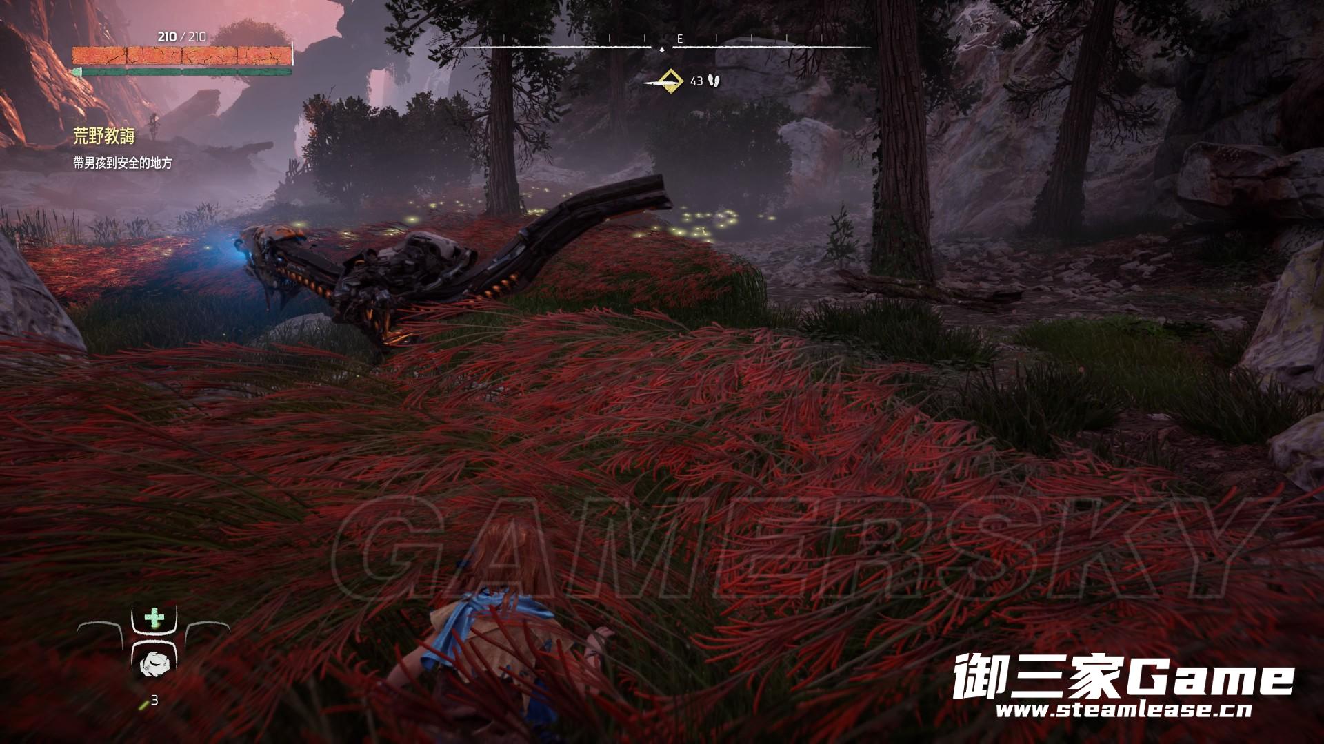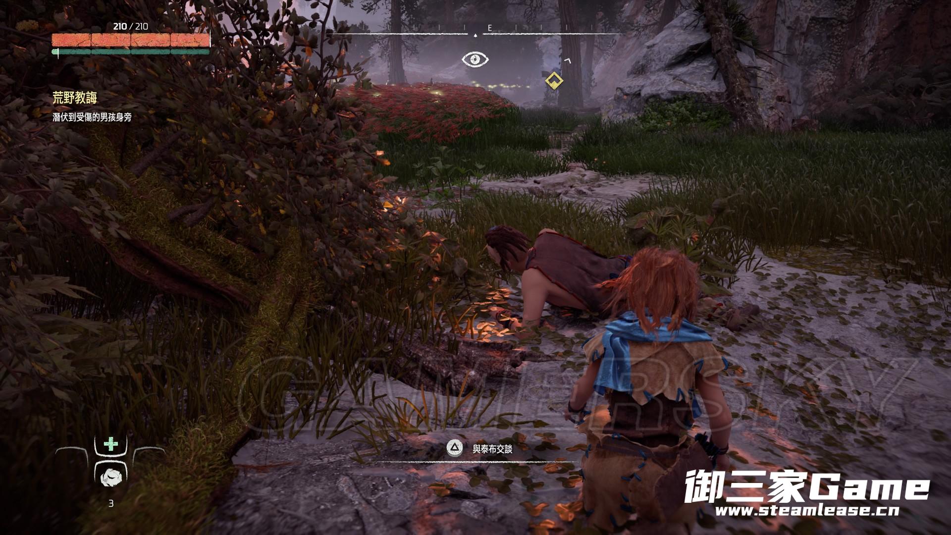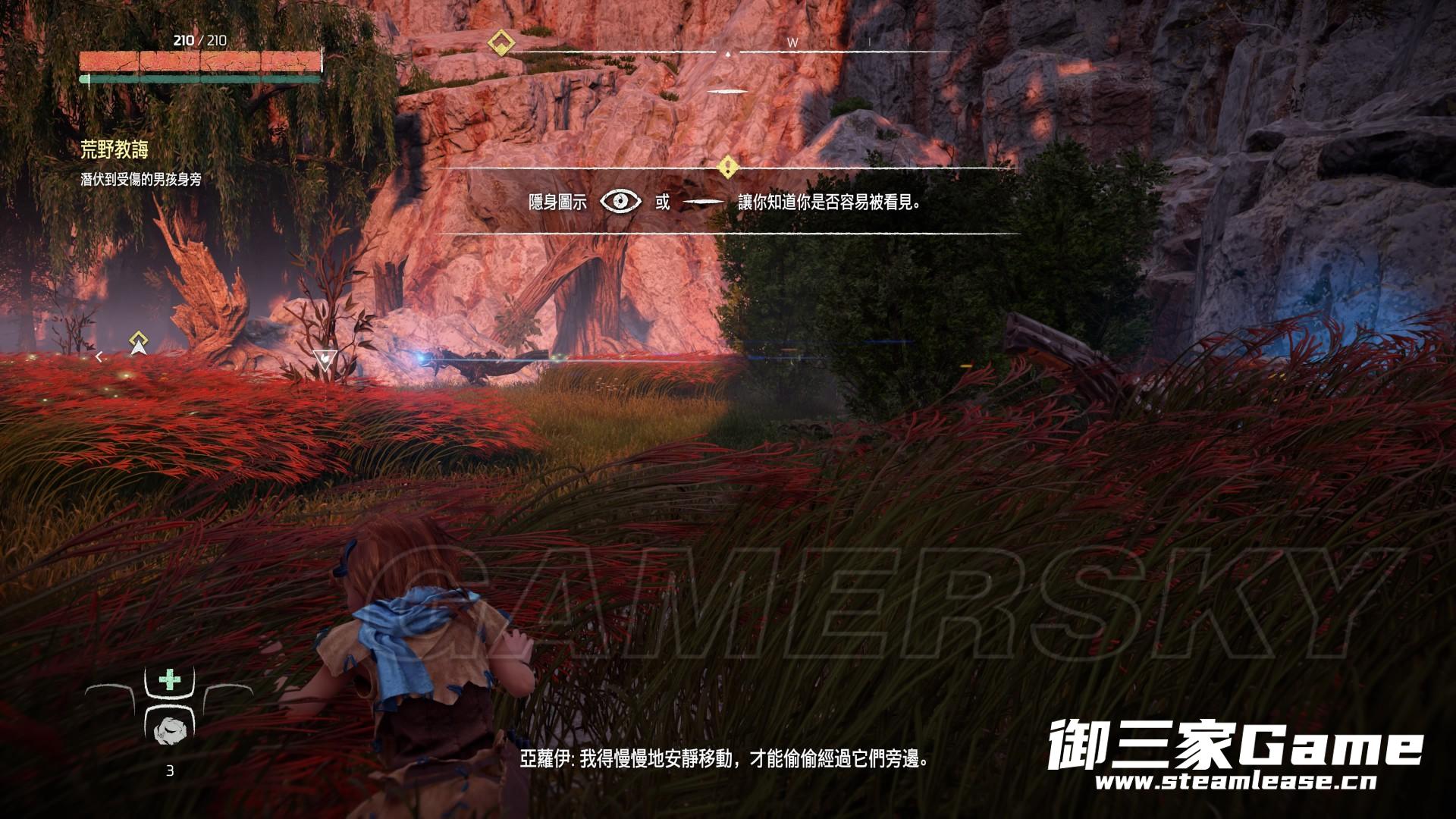 来到对岸草丛注意这里最后一只的守视者,等它回身后直接过去左侧的草丛,后面便是泰布和他交谈,泰布非常惊讶小亚萝伊能够避开这些机械兽,至少他是有救了。