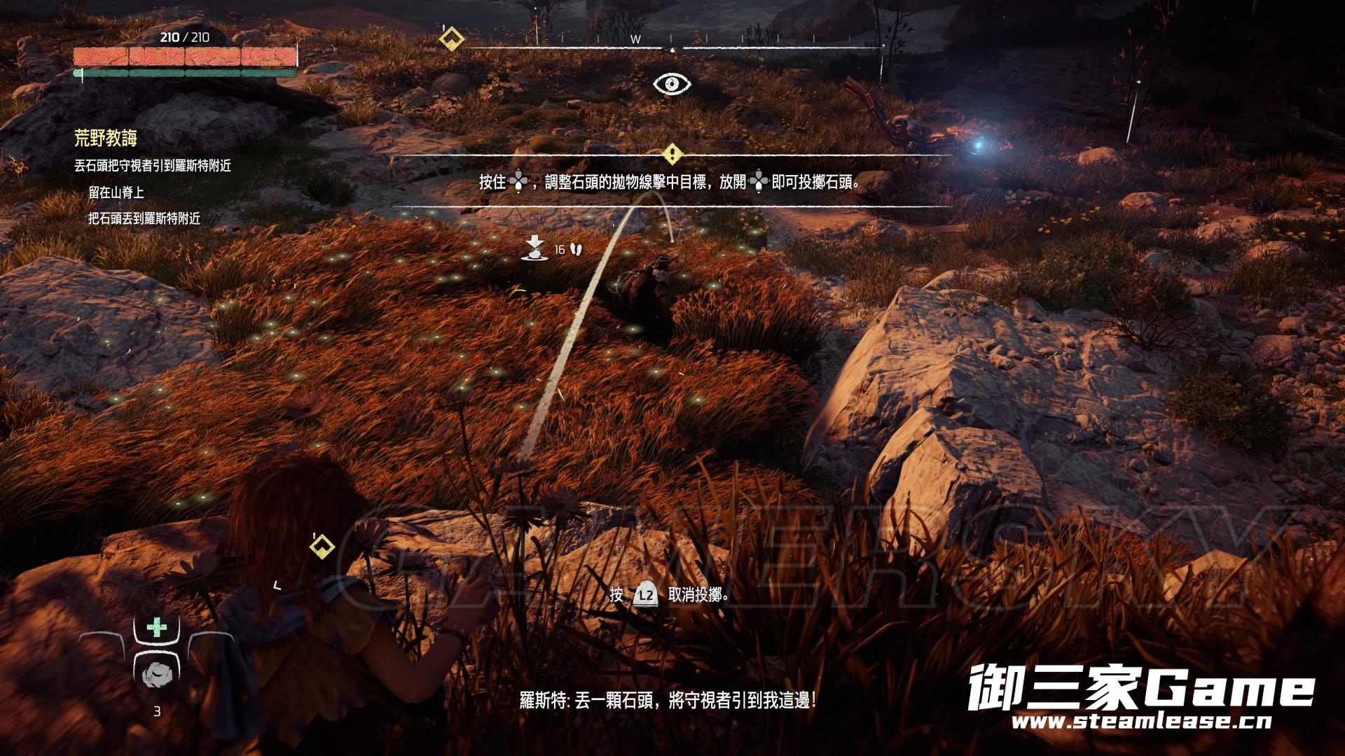 留在山脊上,按住↓键,右摇杆控制方向,松开↓键将石头丢到罗斯特的身旁。