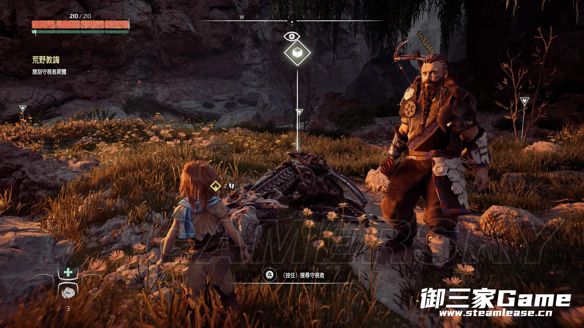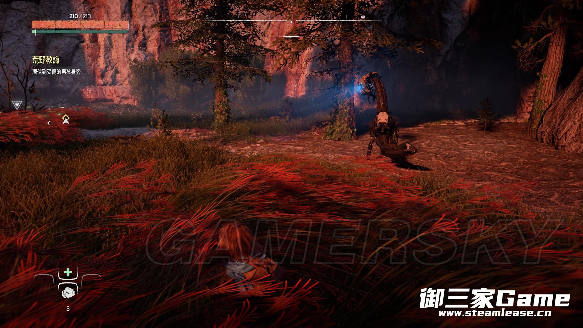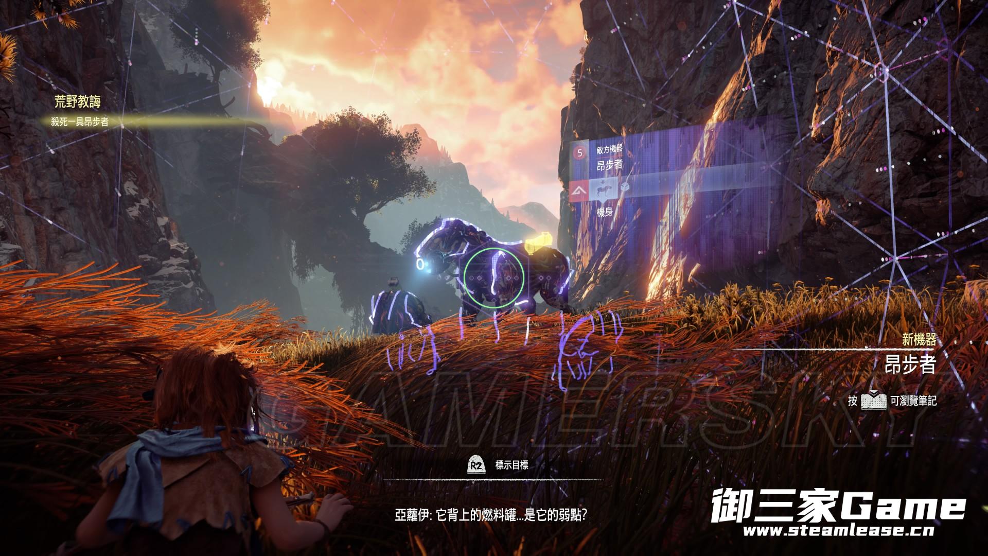面对如此多的机械兽罗斯特也无能为力,不过小亚萝伊借助Focus能知道机械兽的行动路径,她决定试一试,开启Focus扫描机械兽,再按R1能够标记出机械兽的行径,不过这功能比较鸡肋,直接无视,在草丛中等待守视者往左边过去原地巡视时过来河流岸边的草丛