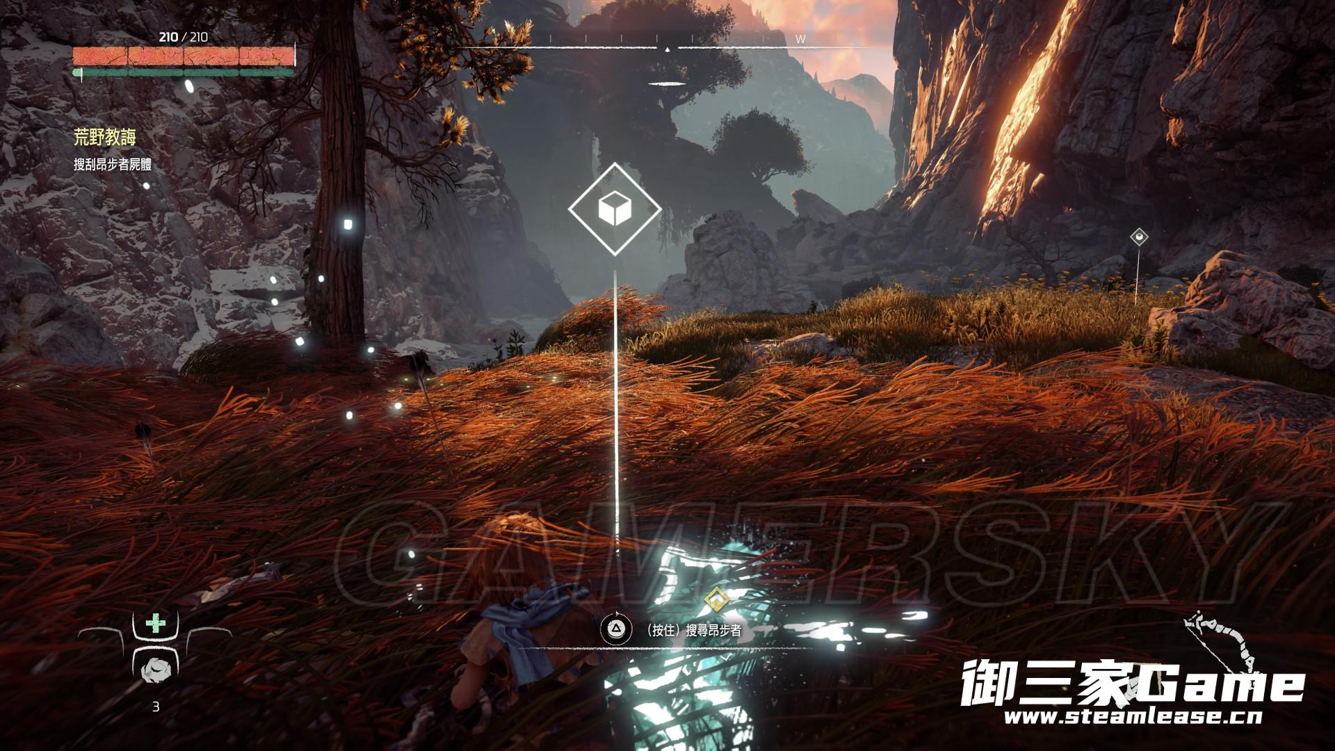 突然间二人发现前面在勇者之径上的小伙失足坠落到谷底,被机械兽团团包围,单按L3切换成跑动,与罗斯特前往小伙附近的山脊。