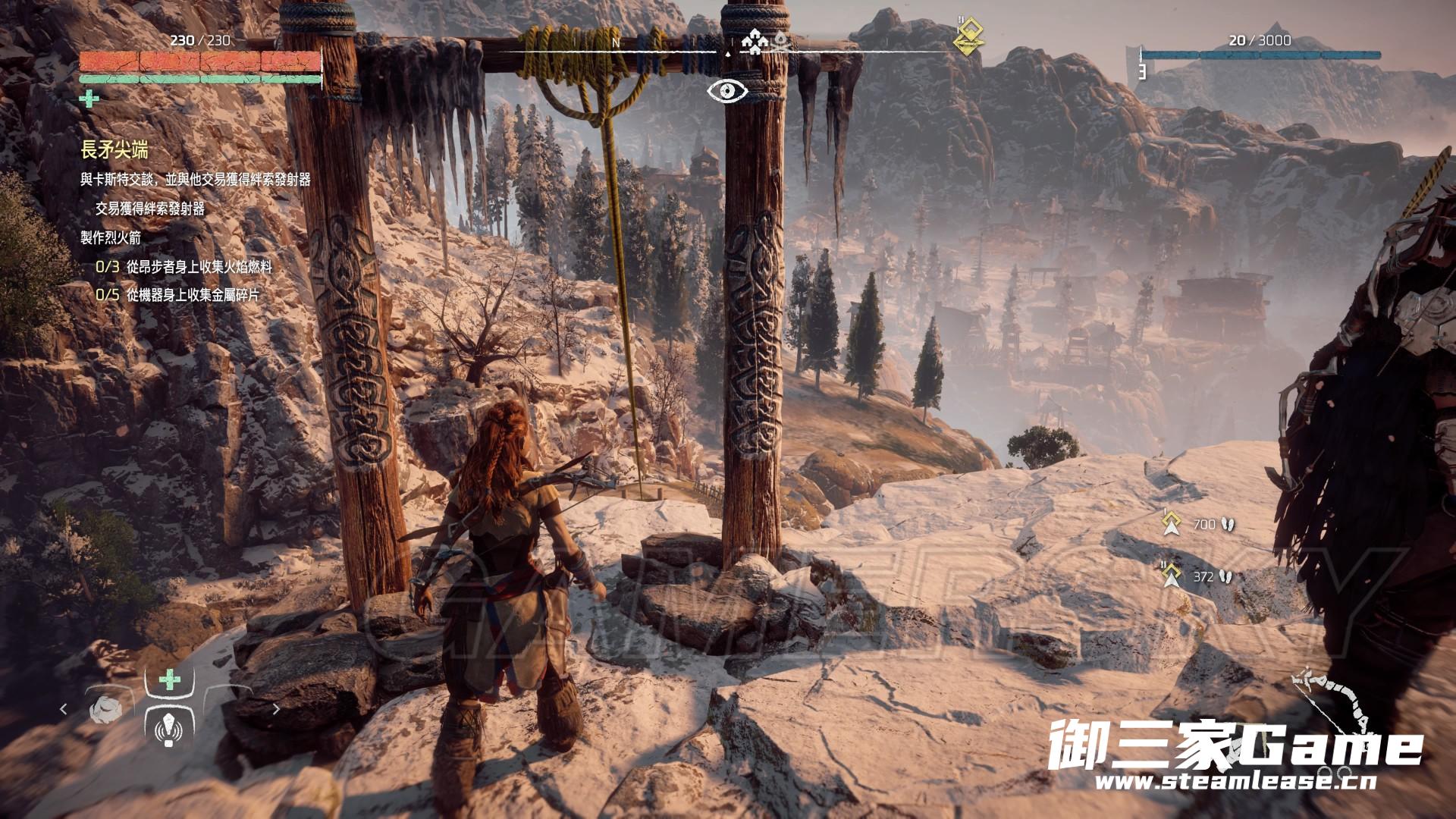 从罗斯特旁边的滑绳按X键跳跃抓取滑索滑落下去,沿路收集物资,例如稜木、金属碎片等等这些在前期都是非常紧缺的物品,看见小动物也顺手砍了。