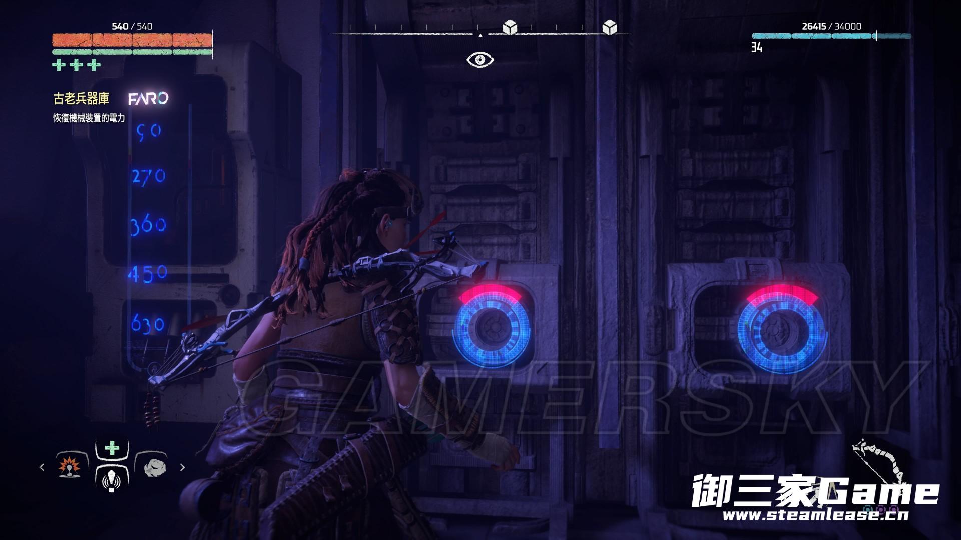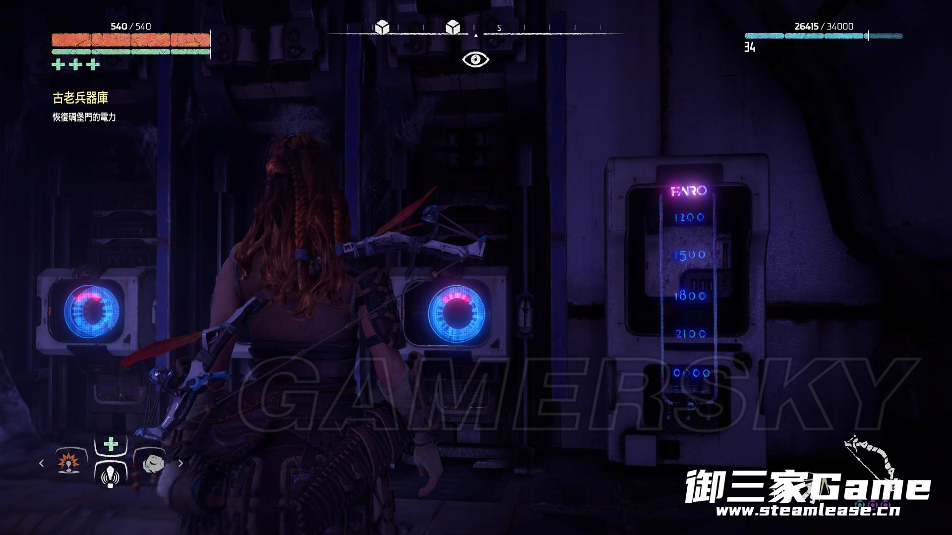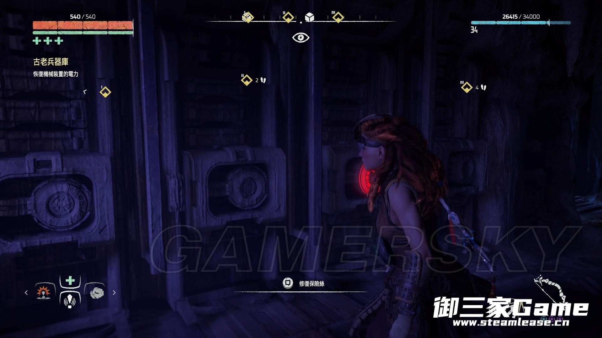 进入兵器库内织物盾被嵌在支架上,过来左边的通道检查安装动力电池,恢复旋钮开关的动力。