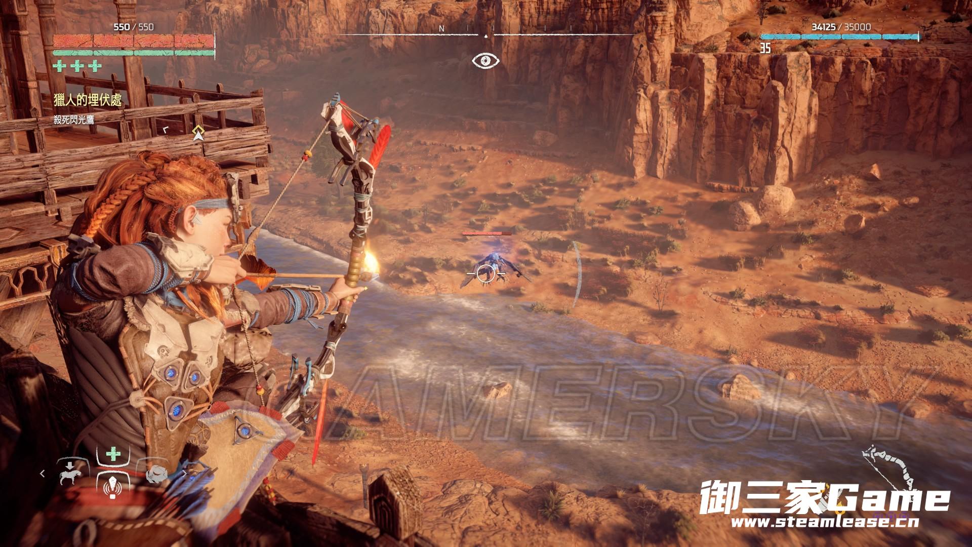 上游山谷内亚萝伊发现成群的牙口兽残骸,难怪会聚集来如此多的闪光鹰,使用Focus标记出牙口兽猎人留下的足迹,攀爬点爬上去往山谷里面走。