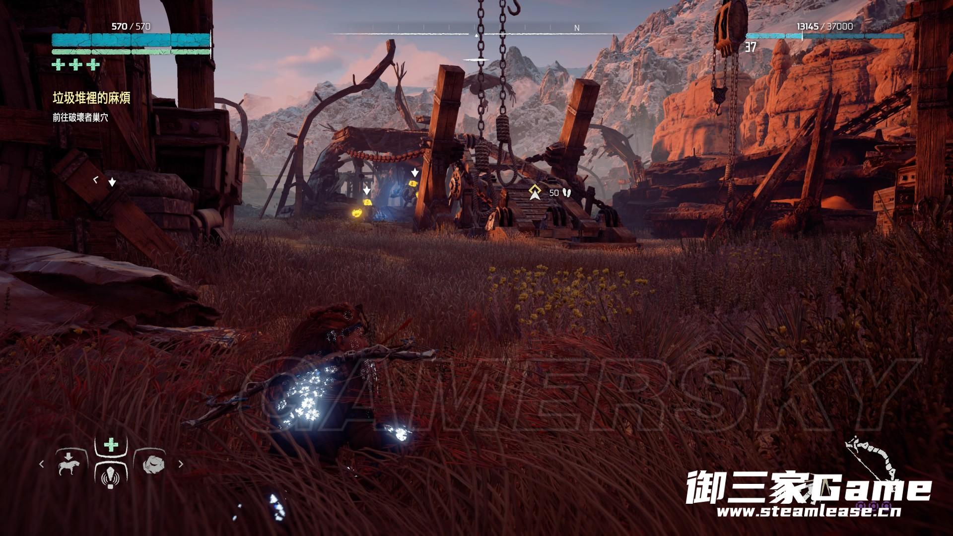 拿完电池,高地之上的土匪首领扬言将要进攻垃圾场聚落,土匪营内右侧的木架上去走出营地。